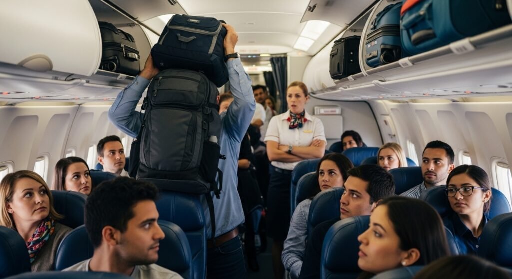 I know it feels helpful to rearrange the bags so everything fits perfectly like a game of Tetris up there. But flight attendants actually hate it when you move other people’s stuff around because it causes confusion when it is time to get off the plane. Just quickly put your own bag away, sit down, and let the crew handle the heavy lifting.