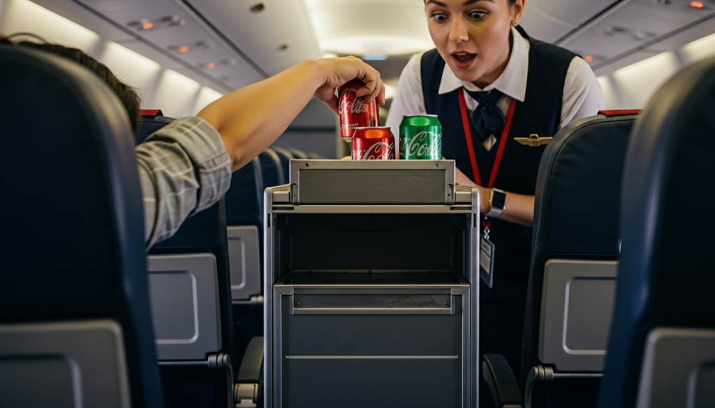 If the drink cart is right there and the flight attendant looks super busy you might think grabbing your own soda is doing them a favor. It actually messes up their whole system and your hands might contaminate the cart which is pretty gross. Just be patient, wait your turn, and let them hand you what you want when they are ready.
