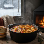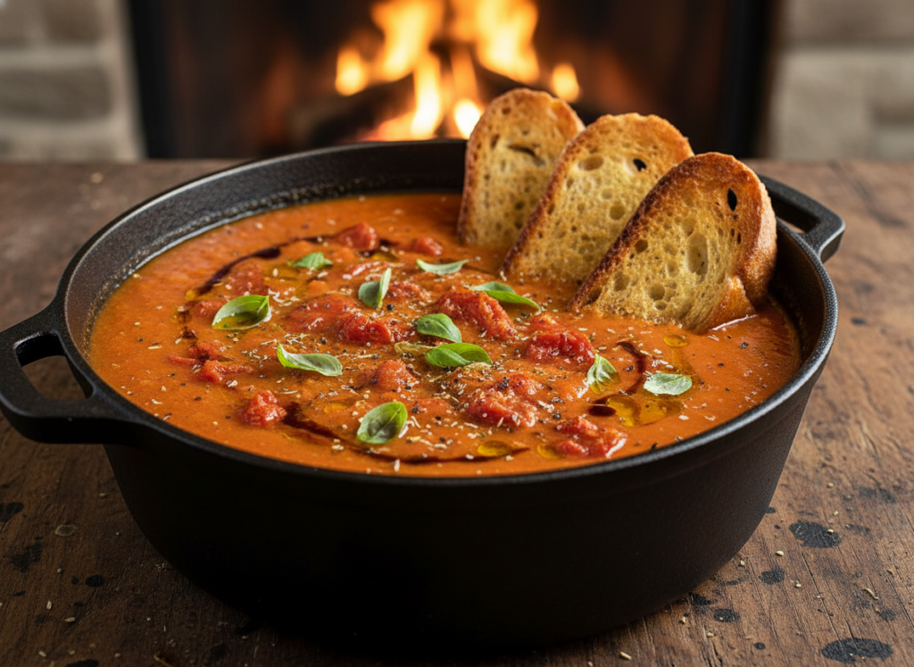 Tomatoes, saucy as soup, are proposed to be cooked down into a warm and creamy soup. Light herbs and smart seasoning contribute richness, but it is lovely with toasted bread or a light supper in its own right.
