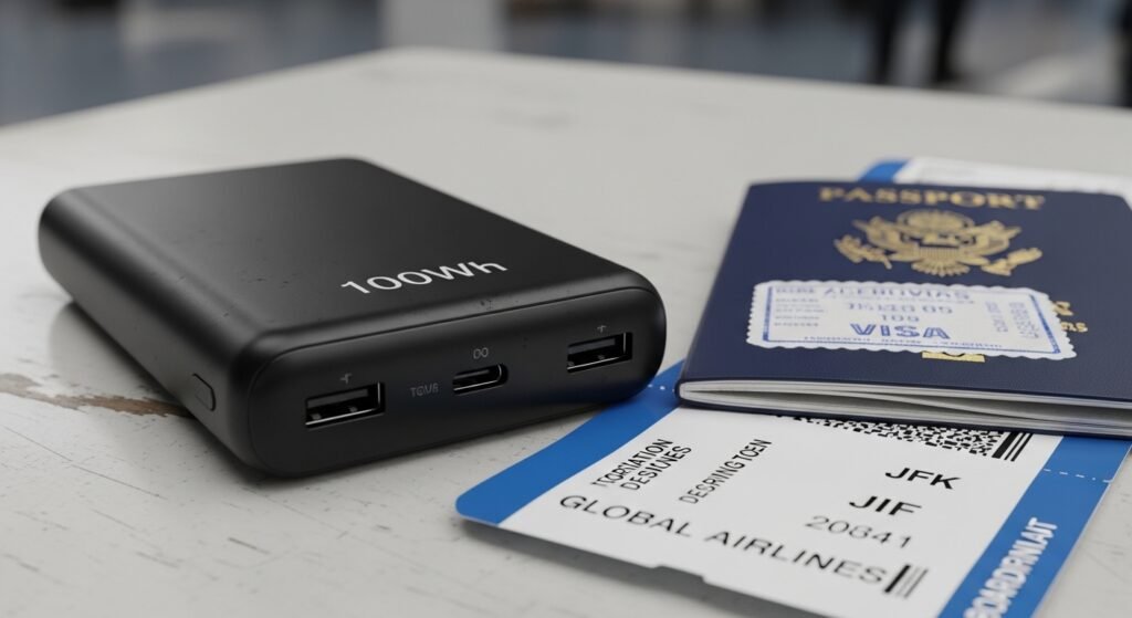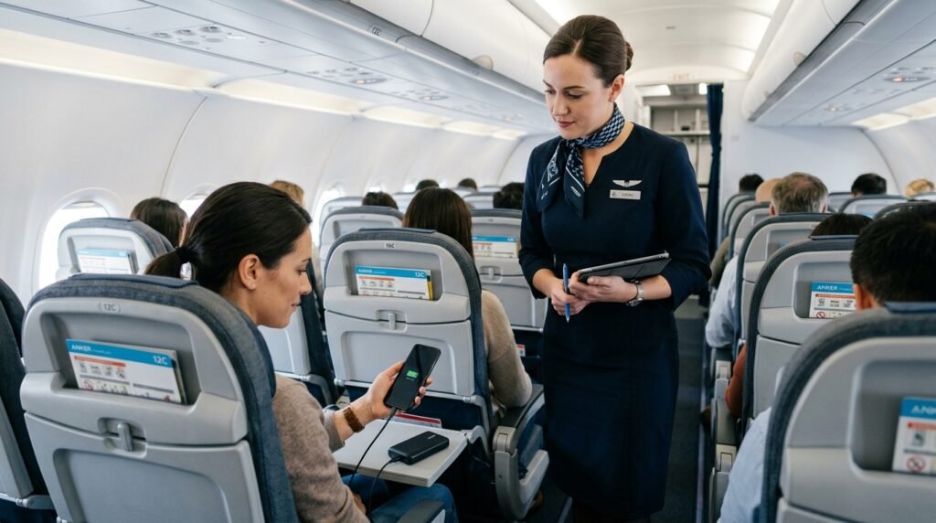 You are completely banned from tossing your power bank into your luggage up in the overhead bin. These devices must stay right with you on your person or packed safely under the seat in front of you.