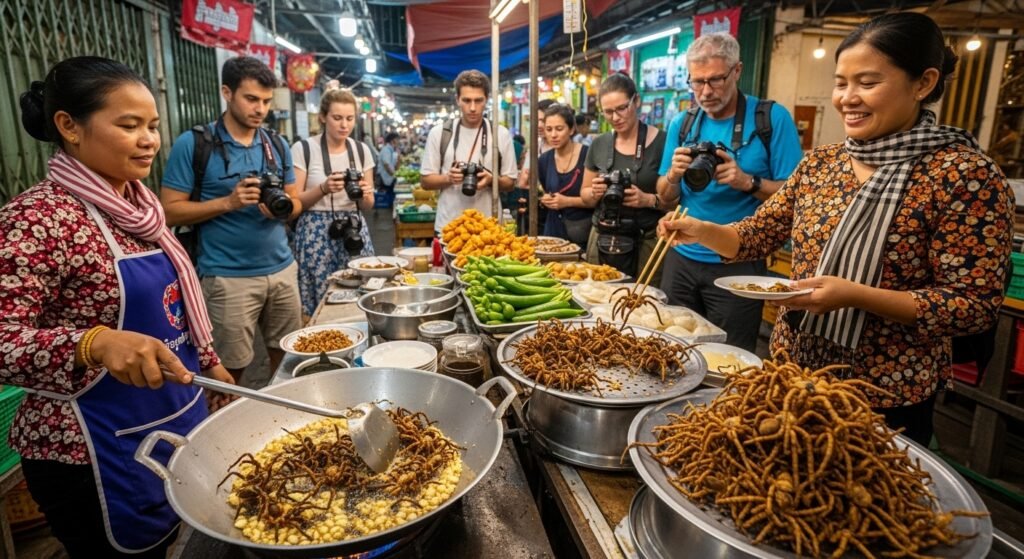 Villagers catch these massive spiders and cook them in hot oil for hungry people passing by. They use garlic and special herbs to make the spiders smell really nice. The outside gets very crunchy while the inside stays soft which is a big surprise.