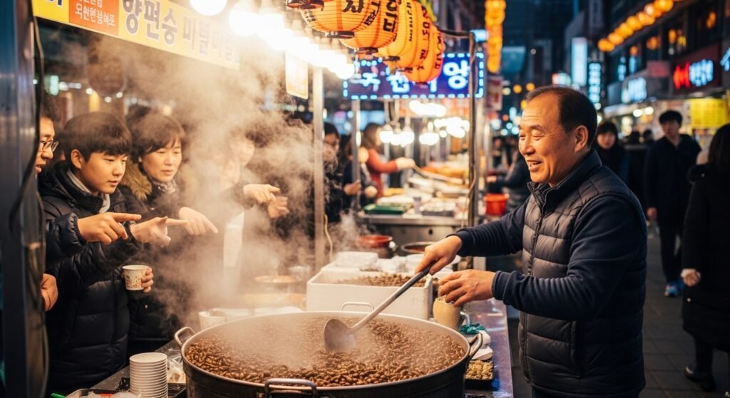 I found that steamed silkworms are a very popular treat found all over the streets of South Korea. They are served in little paper cups by vendors who cook them in big batches. The smell is quite powerful and reaches you from a long distance.