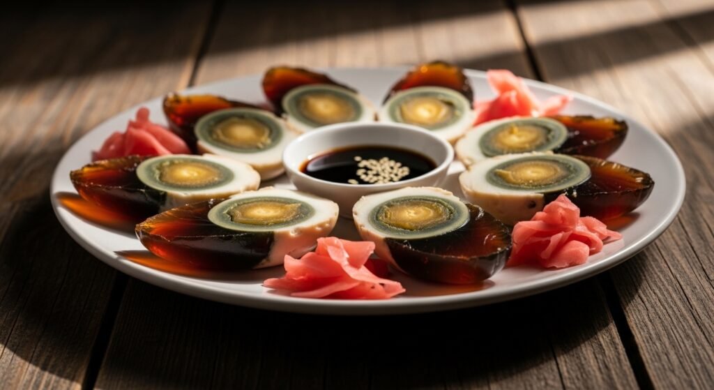 These look like very old black eggs because they are preserved in clay ash and lime for many weeks or months. The color change is dramatic turning the yolk creamy green and the white part brown and jelly like.