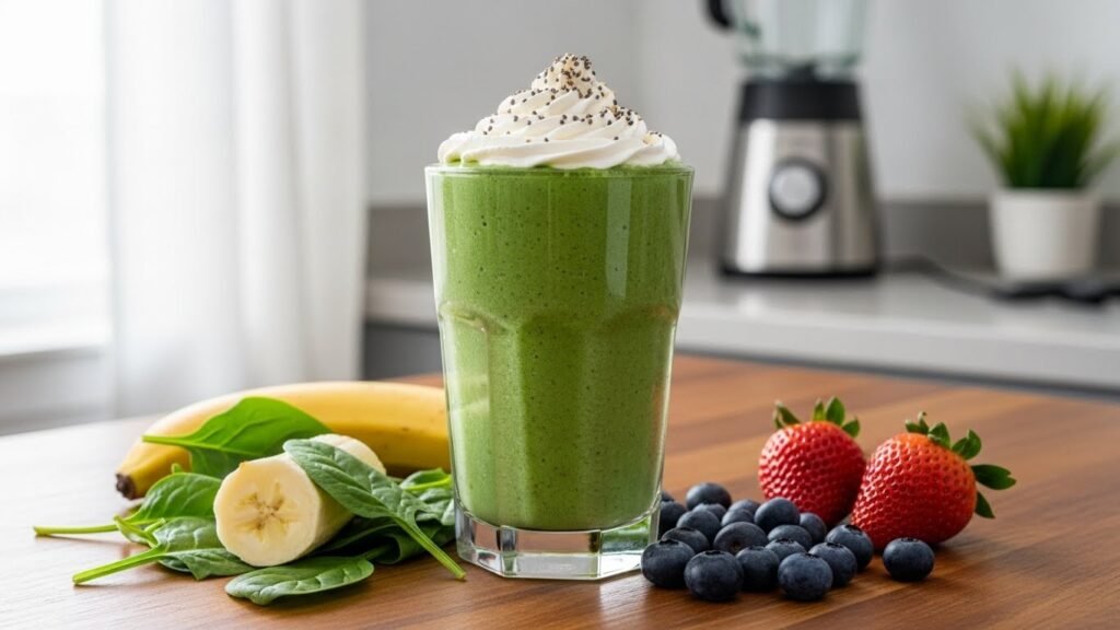 Add protein powder, spinach, and almond milk to a blender and mix until smooth. This makes a quick breakfast you can drink. It works well on busy mornings when sitting down is hard and you need something simple while leaving home in a hurry today.