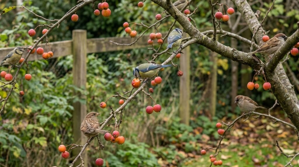 The little fruit that is produced later in the summer and during the fall makes excellent food to the birds and other wild animals. The National Wildlife Federation has found that native and decorative fruit trees help to preserve the biodiversity of the urban environment because of its protection and provision of food throughout the year.