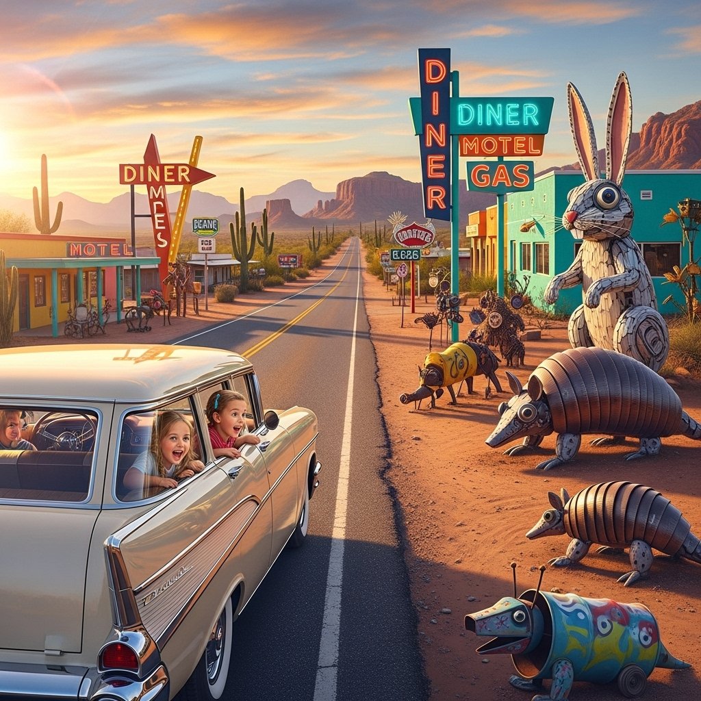 This old road in Arizona makes traveling with kids much easier and more exciting. Bright lights and fun buildings turn the drive into a game for the family. You might see animals at a park or take pictures in a famous town. It stays relaxed.