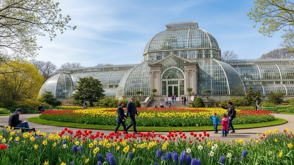 There is a very big garden in the Bronx. It covers a lot of ground with many paths. You can look at plants inside a tall glass structure. Every spring a popular flower show takes place there. It is a common spot for people to visit.