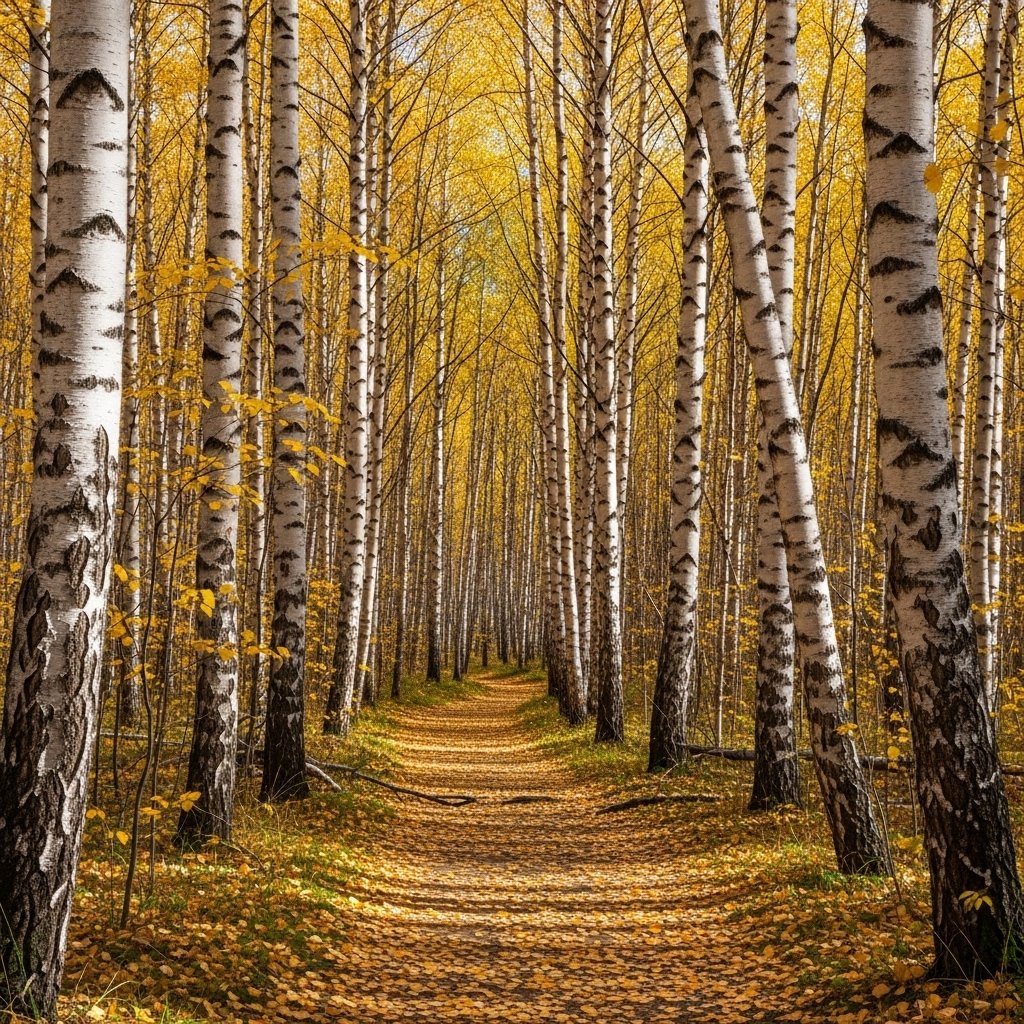 White bark looks like thin paper and it peels off in soft layers. These trees turn a bright yellow when the air gets cold. The light wood and the dark yellow leaves look nice together. You might see them standing out while you walk through the woods.
