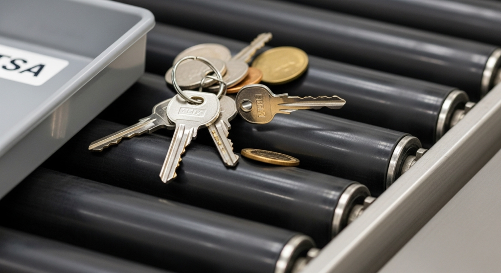 Never place your keys or small snacks directly onto the x-ray conveyor belt because they will probably fall right through the rollers and get lost. It is much better to place those tiny items inside a bowl or just pack them safely away in your main carry on bag.
