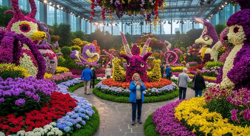 While the hotel is famous this indoor garden area changes every single season and the flower displays they build are truly incredible. Millions of fresh flowers are used to create these huge scenes and walking through here always makes me feel relaxed even with all the crowds around.