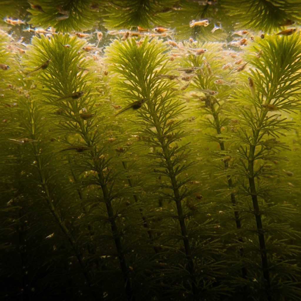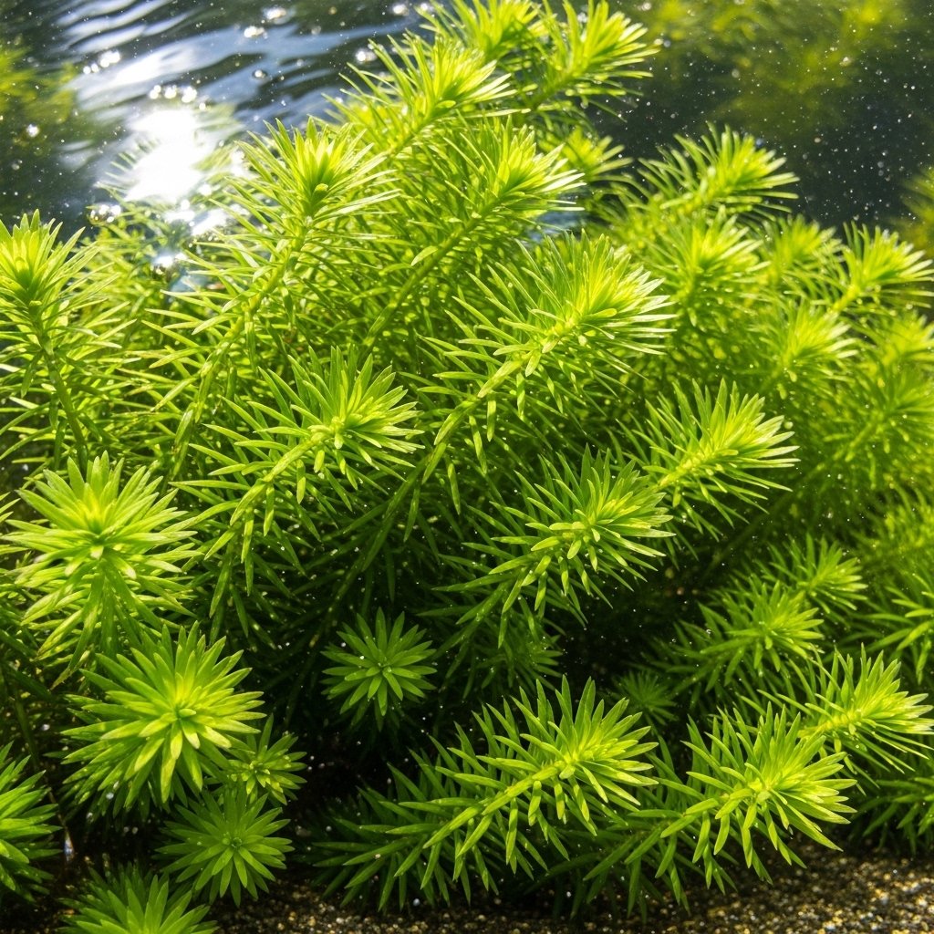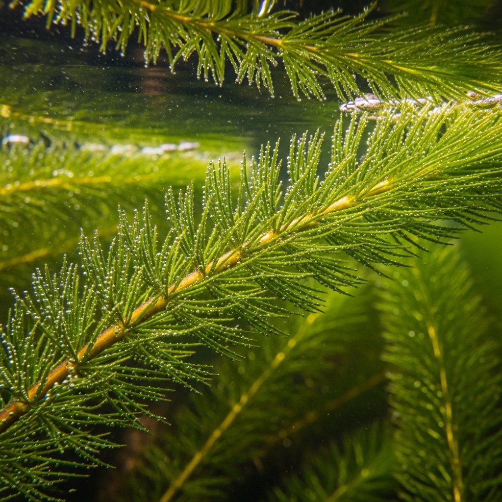 Hornwort is a green plant that lives underwater and has thin leaves like needles. Many people put it in their tanks because it stays alive easily even if you are new to this. It helps keep the water clear by taking in things that should not be there. You can let it float around or try to tuck it into the sand.