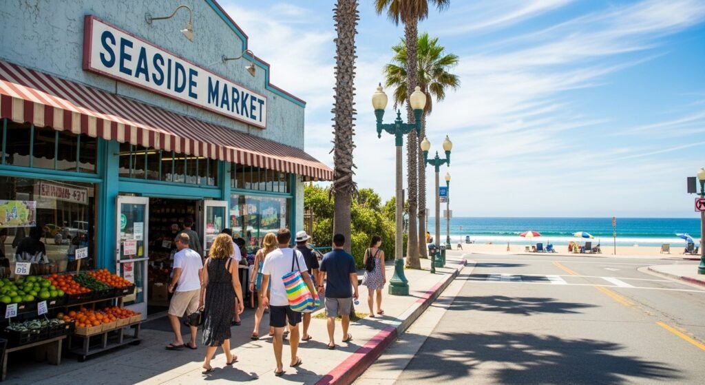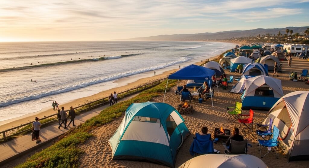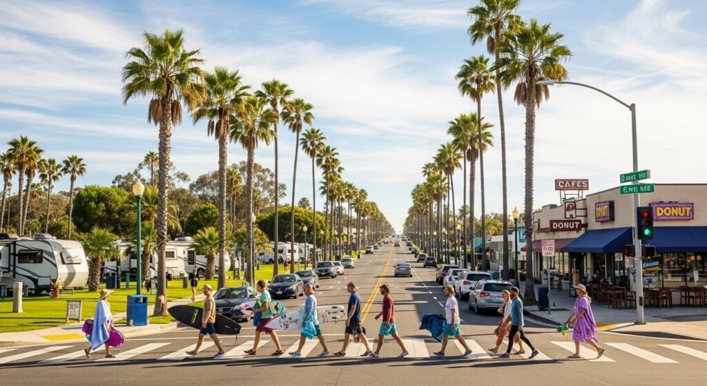 This beach park is on the big highway and feels like a tiny quiet village. It is simple to find and very welcoming. You will love that the stores and water are just a short walk from where you park your car or sleep.