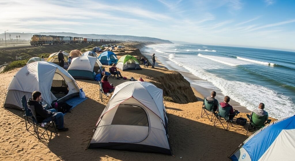 Your tent will be on a high cliff right above the sand. This means you see the bright ocean every morning. Big trains travel nearby throughout the day. The sound of the moving water is very strong. It covers up the noise so you stay calm.