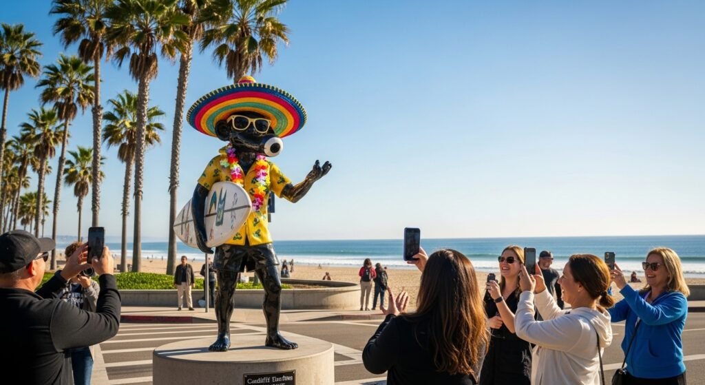 There is this funny statue of a surfer that locals like to dress up in different costumes all the time. You can walk right over to it from the beach and take a picture because it is always wearing something new and silly.