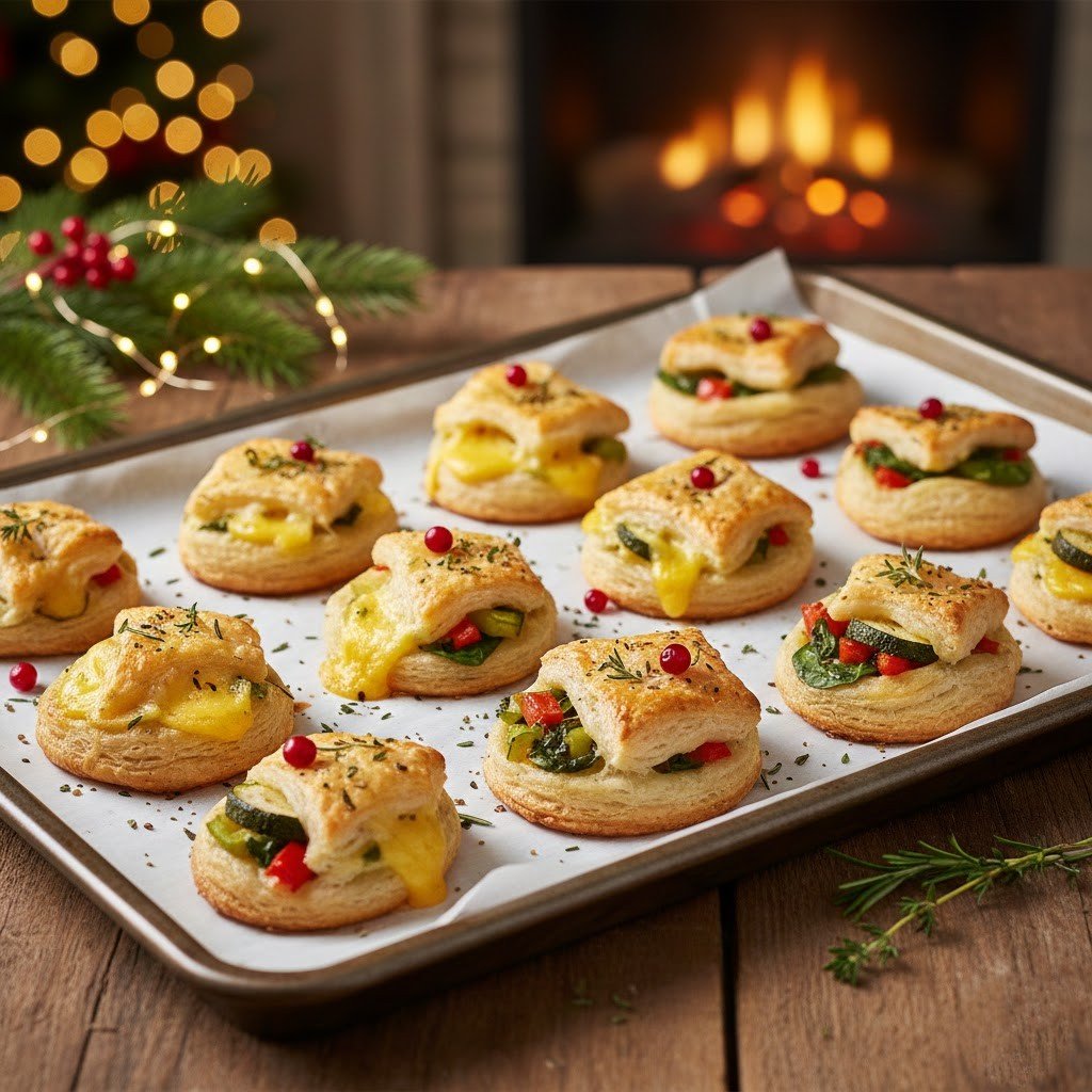 Flaky puff pastry filled with vegetables or cheese is nice and warming. These bites are simple to serve fresh and can be served in formal or informal settings during Christmas, as they are baked to a golden colour.