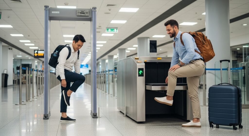 We usually have to take our shoes off to go through the security screening process so wearing complicated boots that are hard to remove can really slow your line down. For your travel days you should wear comfortable and simple slip-on shoes which you can kick off very fast without having to struggle with messy laces.