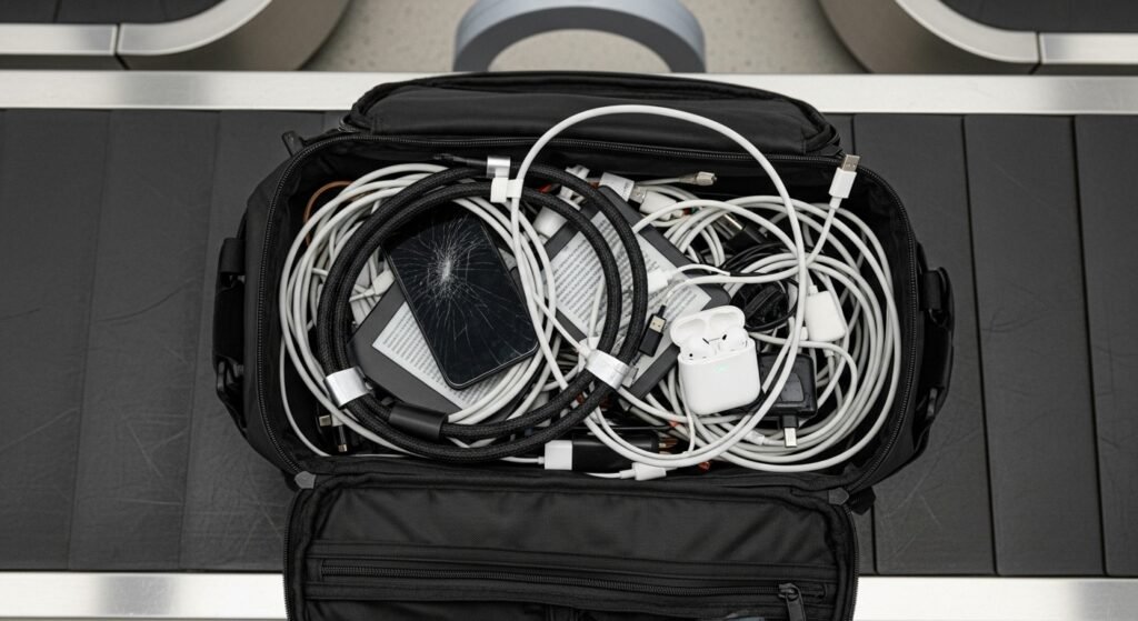 TSA agents tell us that large tangled piles of wires and chargers can obscure the X-ray view of everything else which makes it necessary for them to open the bag and look manually. Using a small pouch or an organizer to keep your charging cords nice and tidy helps the scanner see inside your bag clearly.