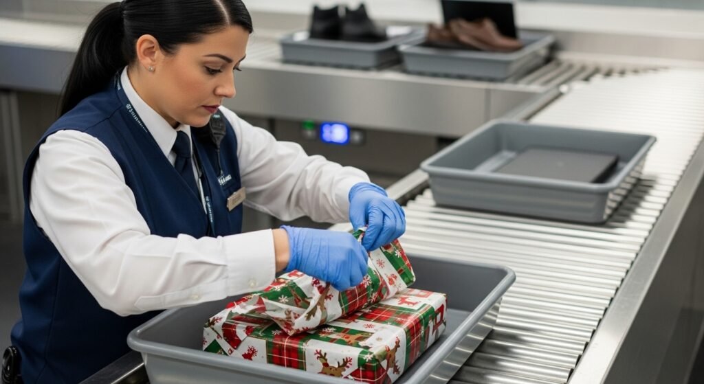If you are traveling with presents security may need to check the items inside so if they are already wrapped nicely they will have to be unwrapped and your pretty paper will get totally destroyed. It is a much better idea to put those gifts in reusable bags or simple gift boxes that can be opened easily in case the agents need to take a quick peek inside.