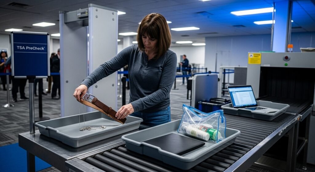 Large necklaces or chunky belts and even bracelets can trigger the metal detector alarms when you walk through which holds everyone else up behind you for a bit. We suggest putting those accessories in your personal carry-on bag before you get to the front and then you can put them back on once you get past all the security checkpoints.