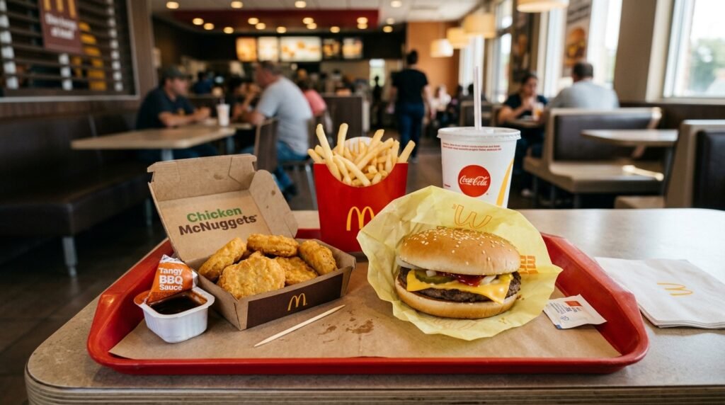 If you sleep in and miss breakfast you can always grab some Chicken McNuggets because you get to decide exactly how many pieces you want based on how hungry you actually are. Ordering a basic hamburger with just one patty and a regular bun is also a pretty solid choice if you want something simple and fast for your lunch without feeling too full.
